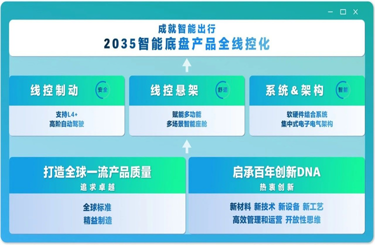 京西集團(tuán)全球CEO鄭潔亮宣布的全球技術(shù)戰(zhàn)略明確了面向未來(lái)十年的戰(zhàn)略目標(biāo)——2035年實(shí)現(xiàn)智能底盤(pán)產(chǎn)品全線控化。該戰(zhàn)略以線控制動(dòng)、線控懸架、系統(tǒng)及架構(gòu)為三大核心支柱,并以全球一流產(chǎn)品質(zhì)量、百年創(chuàng)新DNA為兩大基石。